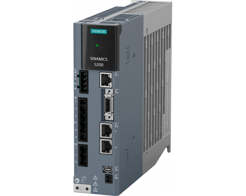 Преобразователь SINAMICS S200 с интерфейсом PROFINET. Входное напряжение составляет 380-480 В, 3AC, с допустимым отклонением -15%/+10%, потребление тока 1.3A, частота 50/60Hz. Выходное напряжение регулируется от 0 до входного значения, ток до 1.3A, частота до 550Hz. Подключен к двигателю мощностью 0.4 кВт. Степень защиты IP20. Габариты: 50x180x200 мм (ШxВxГ).