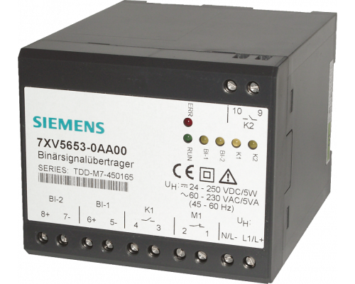 Ретранслятор предназначен для использования с DIN-рейки ми 35 мм и имеет пластиковый корпус. Поддерживается питание 24–250 В DC и 110–220 В AC. Предусмотрено реле оповещения об ошибках. Подключение осуществляется посредством клемм: 2 ДВх и 2 РелВых. Обеспечивается передача данных на расстояние до 2 км по многомодовому оптоволокну 62,5/125 мкм с использованием повторителя 7XV5451. Возможен каскадный режим, увеличивающий расстояние передачи до 14 км при использовании одномодового оптоволокна 9/125 мкм.