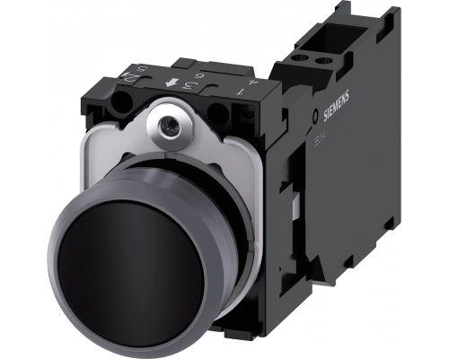 Siemens 3SU1130-0AB10-3FA0 Кнопка, 22mm, круглая, пластик с металлическим фронтальным кольцом, чёрная, плоская, 1NO+1NC