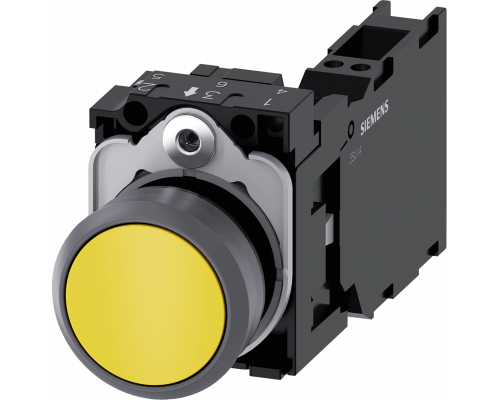 Кнопочный выключатель имеет диаметр 22 мм и круглую форму. Корпус выполнен из пластика с металлическим фронтальным кольцом. Цвет кнопки – желтый. Кнопка плоская, активация происходит нажатием. Предусмотрен держатель для одной нормально замкнущей и одной нормально разомкнутой позиции. Используется пружинная клемма.