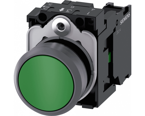 Кнопка диаметром 22 мм имеет круглую форму и выполнена из пластика с металлическим фронтальным кольцом. Цвет кнопки – зелёный, тип – плоская. Кнопка оснащена контактами мгновенного действия и поставляется с держателем. Имеет один нормально открытый (1NO) контакт. Подключение осуществляется посредством винтовых клемм.