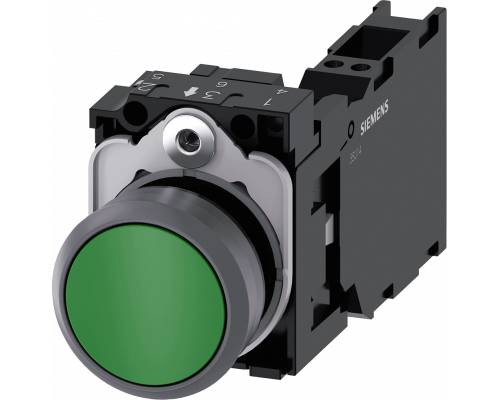 Кнопочный выключатель имеет диаметр 22 мм и круглую форму. Корпус выполнен из пластика с металлическим фронтальным кольцом. Цвет кнопки – зеленый. Кнопка плоская, активация происходит нажатием. Предусмотрен держатель для одной нормально замкнущей и одной нормально разомкнувшей контактов. Подключение осуществляется с помощью пружинной клеммы.