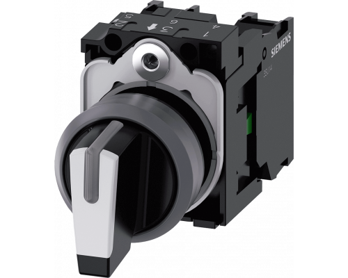 Поворотный переключатель имеет диаметр 22 мм и круглую форму. Корпус изготовлен из пластика с металлическим фронтальным кольцом. Оснащен короткой черной рукояткой с белой вставкой. Предусмотрено три коммутационных положения: i-o-ii с фиксацией. Угол переключения составляет 2x45 град. Доступны варианты углов переключения 10:30h, 12h и 13:30h. В комплекте поставляется держатель. Переключатель имеет два нормально открытых контакта (1NO+1NO) и оснащен винтовыми клеммами.