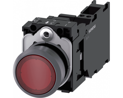 Кнопка диаметром 22 мм имеет круглую форму. Корпус выполнен из пластика с металлическим фронтальным кольцом. Кнопка красного цвета и имеет плоскую конструкцию. Предусмотрены контакты мгновенного действия 1NO+1NC. В комплекте поставляется держатель. Подсветка реализована с помощью модуля, включающего интегрированный светодиод, работающий от 24V AC/DC. Подключение осуществляется через пружинные клеммы.