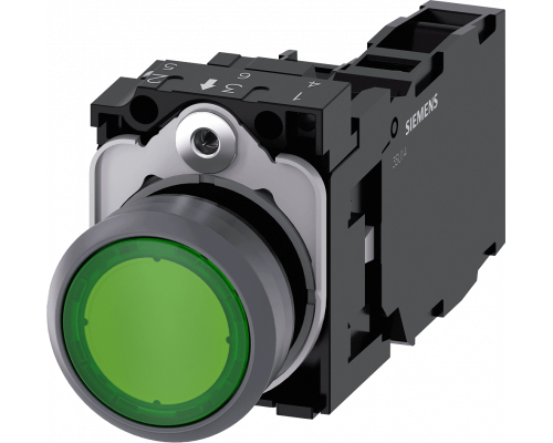 Кнопка диаметром 22 мм имеет круглую форму. Корпус выполнен из пластика с металлическим фронтальным кольцом. Кнопка зелёного цвета и плоского типа. Контакты обеспечивают мгновенное действие и имеют конфигурацию 1NO+1NC. Предусмотрен держатель и модуль подсветки с интегрированным светодиодом, работающим от 110 Вольт переменного тока. Подключение осуществляется посредством винтовых клемм.