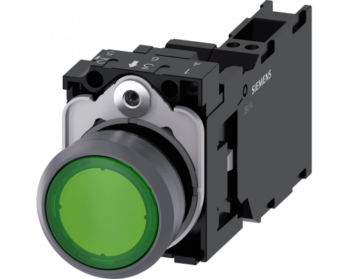 Кнопка диаметром 22 мм имеет круглую форму. Корпус выполнен из пластика с металлическим фронтальным кольцом. Цвет кнопки - зелёный. Контакты - мгновенного действия, тип 1NO+1NC. Предусмотрен держатель и модуль подсветки с интегрированным светодиодом, работающим от 24V AC/DC. Подключение осуществляется через пружинные клеммы.