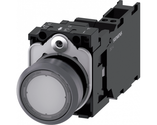 Кнопка диаметром 22 мм имеет круглую форму. Корпус выполнен из пластика с металлическим фронтальным кольцом, а кнопка – прозрачная и плоская. Контакты обеспечивают мгновенное действие и имеют конфигурацию 1NO+1NC. В комплекте поставляется держатель и модуль подсветки с интегрированным светодиодом, работающим от 24V AC/DC. Подключение осуществляется посредством пружинных клемм.