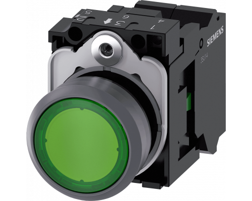 Кнопка диаметром 22 мм имеет круглую форму. Корпус выполнен из пластика с металлическим фронтальным кольцом. Цвет кнопки - зелёный. Контакты обеспечивают мгновенное действие, тип - 1NO. В комплекте присутствует держатель. Подсветка реализована с помощью интегрированного светодиода, работающего от 24v ac/dc. Клеммы - пружинные.