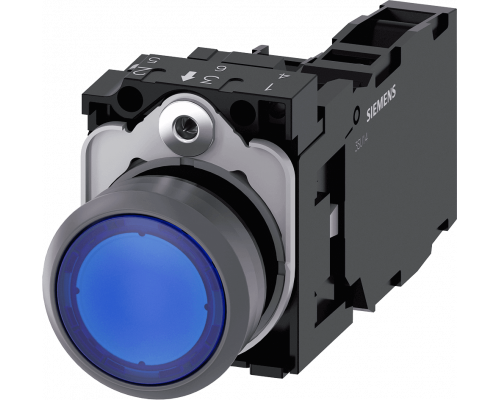 Кнопка диаметром 22 мм имеет круглую форму. Корпус выполнен из пластика с металлическим фронтальным кольцом, а цвет кнопки – синий. Контакты являются мгновенного действия и имеют конфигурацию 1NO+1NC. Предусмотрен держатель и модуль подсветки, включающий интегрированный светодиод, работающий от 24V AC/DC. Подключение осуществляется посредством винтовых клемм.