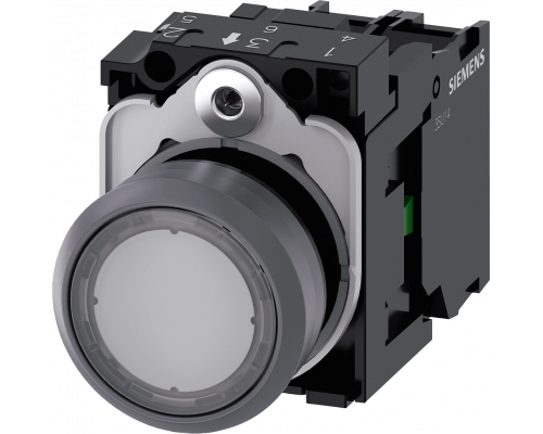 Кнопка имеет диаметр 22 мм и круглую форму. Корпус выполнен из пластика с металлическим фронтальным кольцом. Кнопка прозрачная и плоская. Имеются контакты мгновенного действия 1NO. В комплекте поставляется держатель. Подсветка реализована с помощью модуля, включающего интегрированный светодиод, работающий от 110 Вольт переменного тока. Подключение осуществляется посредством винтовых клемм.