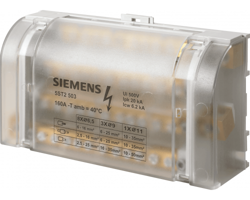 Распределительный блок предназначен для распределения электроэнергии. Он имеет 4 полюса и рассчитан на ток 160A и напряжение 500V. Ввод осуществляется кабелем сечением 1x10-35mm2. Выводы включают 3 контакта сечением 6-25mm2 и 8 контактов сечением 25mm2. Устройство устанавливается на DIN-рейку.