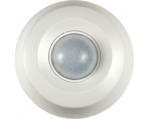 Датчик движения предназначен для потолочной установки. Он работает от напряжения 230 VAC и способен коммутировать нагрузки до 3000 Вт. Устройство имеет накладной тип монтажа.
