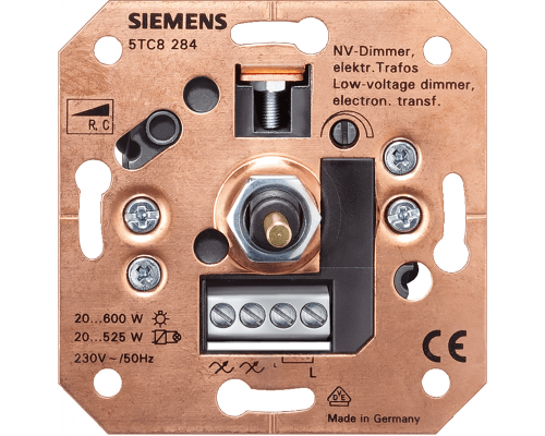 Диммер низковольтный нажимного типа, предназначен для включения и выключения, а также регулировки яркости ламп. Работает от сети 230В с частотой 50-60 Гц и предназначен для нагрузки от 60 до 600 Вт и от 25 до 500 ВА. Имеет электронный трансформатор и электронно-механическое управление. Конструкция включает монтируемую под штукатурку часть с креплением на лапках и винтовым креплением.