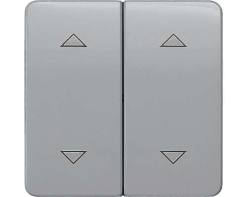 Представлен выключатель Delta profil серебряного цвета. Устройство оснащено двумя клавишами. На клавишах изображены символы, обозначающие направления "вверх" и "вниз". Подходит для управления механизмами, требующими изменения направления движения.