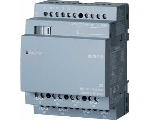Модуль расширения Logo! dm16 230r предназначен для расширения функциональности контроллеров Logo!. Напряжение питания модуля составляет 230 В, а напряжение входов/выходов – также 230 В. Используются реле для подключения выходов. Ширина модуля составляет 4TE. Включает в себя 8 дискретных входов (di) и 8 дискретных выходов (do). Совместим с Logo! 8.