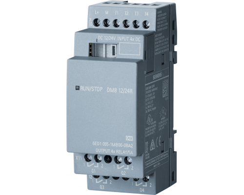 Модуль расширения предназначен для использования с контроллерами Logo! 8. Обеспечивает питание 12 и 24 вольт. Имеет 4 дискретных входа и 4 дискретных выхода, реализованных на реле. Ширина модуля составляет 2 те. Подключается к контроллерам Logo! 8.