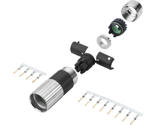 Разъем предназначен для передачи сигнала типа DRIVE-CLiQ. Конструкция включает в себя 10-полюсный разъем M17 с полной резьбой и накидной гайкой. Изолированная проводящая часть состоит из 10 контактов AWG 20-24, 4 контактов AWG 24-28 и одного кабельного терминала с диапазоном 6.0-9.5 мм. Предусмотрен 1x 10-контактный изолированный провод.