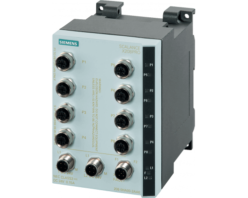 Управляемый промышленный коммутатор Scalance X208 PRO оснащен восемью портами 10/100 Мбит/с типа M12. Обеспечивается защита IP65/67. Питание осуществляется от 24 В DC. Предусмотрена диагностика и поддержка PROFINET-IO.