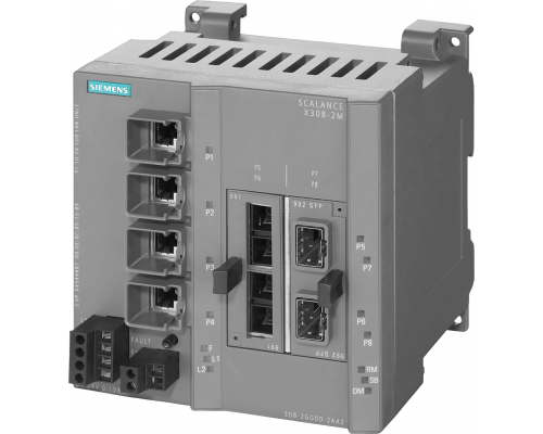 Управляемый промышленный коммутатор Scalance X308-2M оснащен четырьмя портами 10/100/1000 Мбит/с с разъемами RJ45 и двумя портами 100/1000 Мбит/с для подключения оптоволоконных медиаконвертеров. Предусмотрена диагностика, резервный блок питания и поддержка Profinet-IO device.