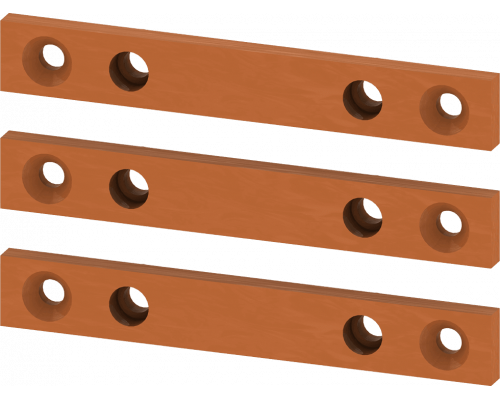Используются медные шины. Распределитель имеет ток 630 А. Предназначен для линейных предохранительных выключателей-разъединителей NH00. Длина шины составляет 250 мм. Размеры шины: 30 x 10 мм. В комплекте три шины с запрессованными гайками.