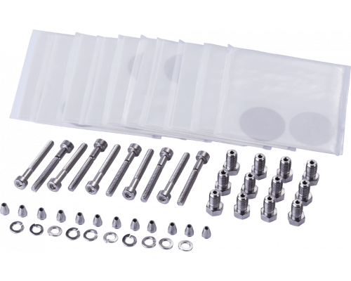 Комплект предназначен для ремонта модели 50. В состав входят шайбы, изготовленные из нержавеющей стали. Также в комплекте присутствуют винты M3x25 с розеткой и крышкой головки. Набор включает фитинги, гайки 1/16'' t от Valco и элементы для модели 50 3/4''.