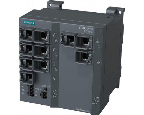 Управляемый промышленный коммутатор Scalance X310 FE оснащен десятью портами 10/100/1000 Мбит/с с разъемами RJ45. Поддерживается диагностика и интегрирован резервный блок питания. Устройство выполнено как PROFINET-IO device.