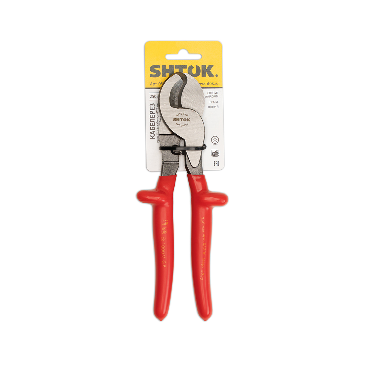 Фото. Диэлектрический кабелерез SHTOK 08206 выполнен из стали, обеспечивающей долгий срок эксплуатации инструмента. Рукоятки оснащены специальными упорами для надежности захвата и удержания инструмента. Возможна резка одно- и многожильного провода.