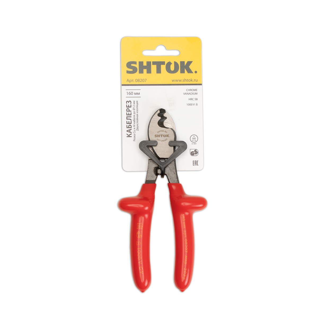 Фото. Диэлектрический кабелерез SHTOK 08207 используется для работы под напряжением. Инструмент выполнен из стали и оснащен удобными рукоятками. Предусмотрены специальные упоры на рукоятках для надежности удержания инструмента во время работы.