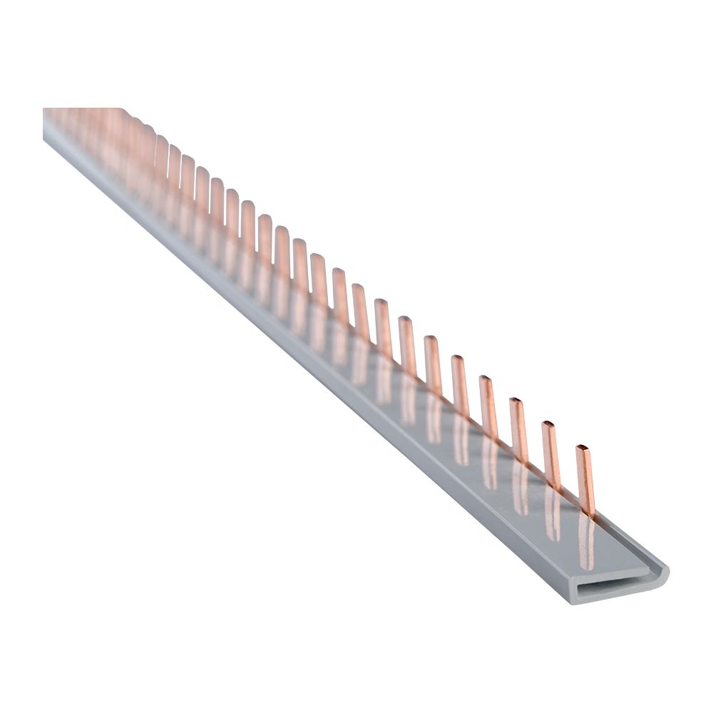 Шины соединительные представляют собой пластины, выполненные из меди, закрепленные в корпусе из диэлектрического материала, не поддерживающего горения и выпускаются стандартной длиной 1 метр. В наличии полный перечень шин для подключения 1, 2, 3, 4 полюсных устройств на токи до 100 А.