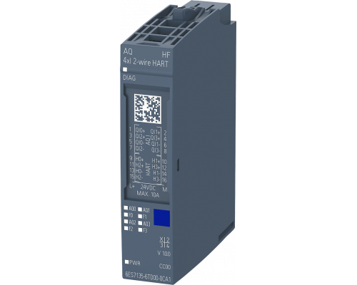 Модуль аналоговых выходов поддерживает HART. Он имеет расширенные функции и предназначен для установки на базовые блоки типов A0, A1. Цветовой код модуля – CC00. Обеспечивается поканальная диагностика и 16-битная разрядность. Точность составляет +/-0.3%. Рабочая температура составляет -40 ... +60°C. Модуль имеет конформное покрытие и основан на базе 6ES7135-6TD00-0CA1.