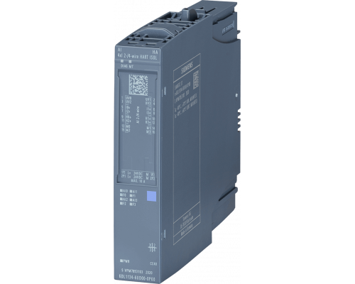 Модуль предназначен для аналогового ввода HART. Поддерживает 2- и 4-провод HART. Совместим с клеммными блоками K0, L0. Имеет цветовую кодировку CC01. Обеспечивается диагностика каналов. Разрядность – 16 бит. Точность составляет +/-0.1%.