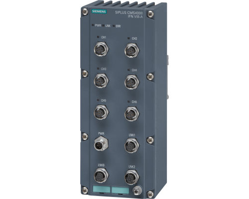 Система Siplus cMS включает аппаратное обеспечение IFV-A для сбора аналоговых сигналов и обнаружения вибраций машины. Предусмотрено 6 iepe-входов для измерения виброускорения. Напряжение питания датчиков составляет 24 ВDC. Обеспечивается степень защиты IP67.