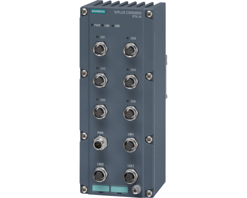 Устройство Siplus CMS предназначено для обработки аналоговых сигналов. Обеспечивается сбор аналоговых сигналов в диапазоне 6/+-10V и частотой 192 кгц. Питание осуществляется от 24VDC (Ub=24vdc). Степень защиты корпуса соответствует IP67.