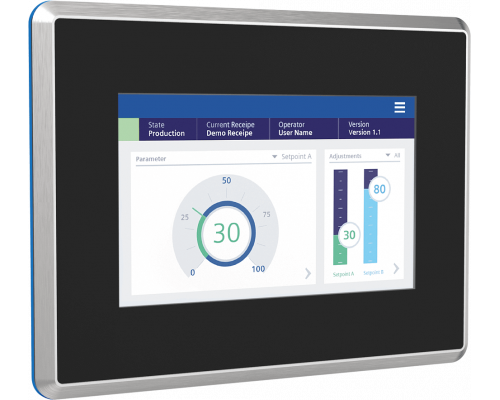 Панель оператора SIMATIC HMI MTP700 имеет гигиеничный дизайн и степень защиты IP69. Корпус выполнен из нержавеющей стали. Дисплей – 7-дюймовый широкоэкранный TFT с разрешением 16 миллионов цветов. Обеспечена защита от ударов и разлета осколков дисплея согласно директиве DIN EN 1672-2. Используется синяя прокладка, соответствующая FDA. Панель оснащена интерфейсом PROFINET и может быть настроена с помощью WinCC Unified Comfort V17. В комплекте поставляется Blu-Ray диск с открытым программным обеспечением, предоставляемым бесплатно.