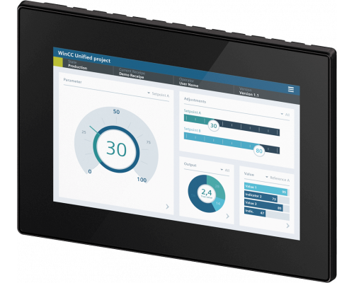 Панель Simatic HMI относится к серии unified comfort. Она имеет широкоформатный TFT-дисплей с диагональю 10.1 дюйма и способна отображать 16 миллионов цветов. Управление осуществляется посредством сенсорного экрана. Поддерживается интерфейс PROFINET. Настройка панели производится в среде разработки WinCC Unified Comfort V16. Панель содержит открытые порты.