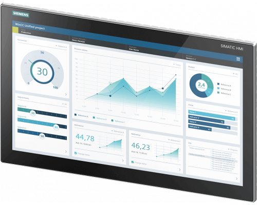 Панель Simatic HMI серии unified comfort представляет собой панель оператора с широкоформатным TFT-дисплеем диагональю 21.5 дюйма. Дисплей поддерживает 16 миллионов цветов. Управление осуществляется при помощи сенсорного экрана. Интерфейс панели – PROFINET. Настройка панели осуществляется в среде разработки WinCC Unified Comfort V16. Содержит компоненты с открытым кодом.
