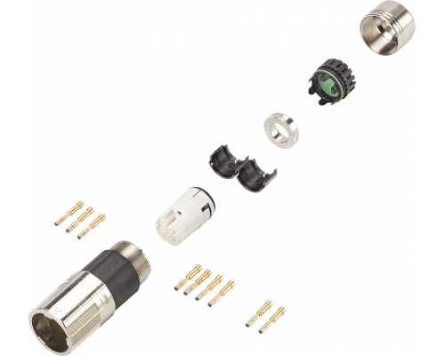 Штекер имеет 7 позиций и использует быстродействующее соединение. В конструкции предусмотрена накидная гайка. В штекер входит один 7-позиционный изолированный элемент, девять гнездовых контактных элементов для проводов сечением 0,5-1,5 мм² и один кабельный зажим для кабелей диаметром 9,5-12 мм.
