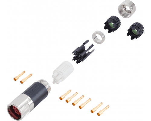 Штекер представляет собой быстродействующее соединение розетка. В комплекте накидная гайка и один изоляционный элемент. Содержит пять гнездовых контактных элементов для проводов сечением от 1,5 до минимизированных 4 мм². Также включает пять гнездовых контактных элементов для проводов сечением от 6 до 16 мм². Предусмотрены три тормозных контакта для проводов сечением от 1 до 2,5 мм². Наконец, в комплекте два кабельных элемента.