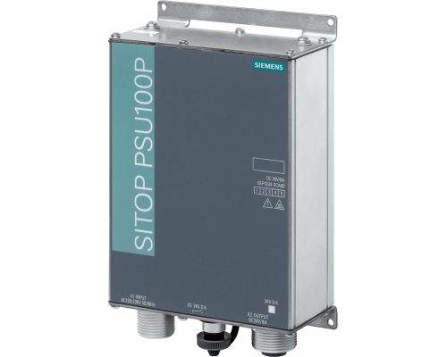 Блок электропитания Sitop PSU100P имеет степень защиты IP67. Обеспечивает выходное напряжение DC 24 В и ток до 8 А. Входное напряжение составляет AC 120/230 В. Блок питания регулируемый.
