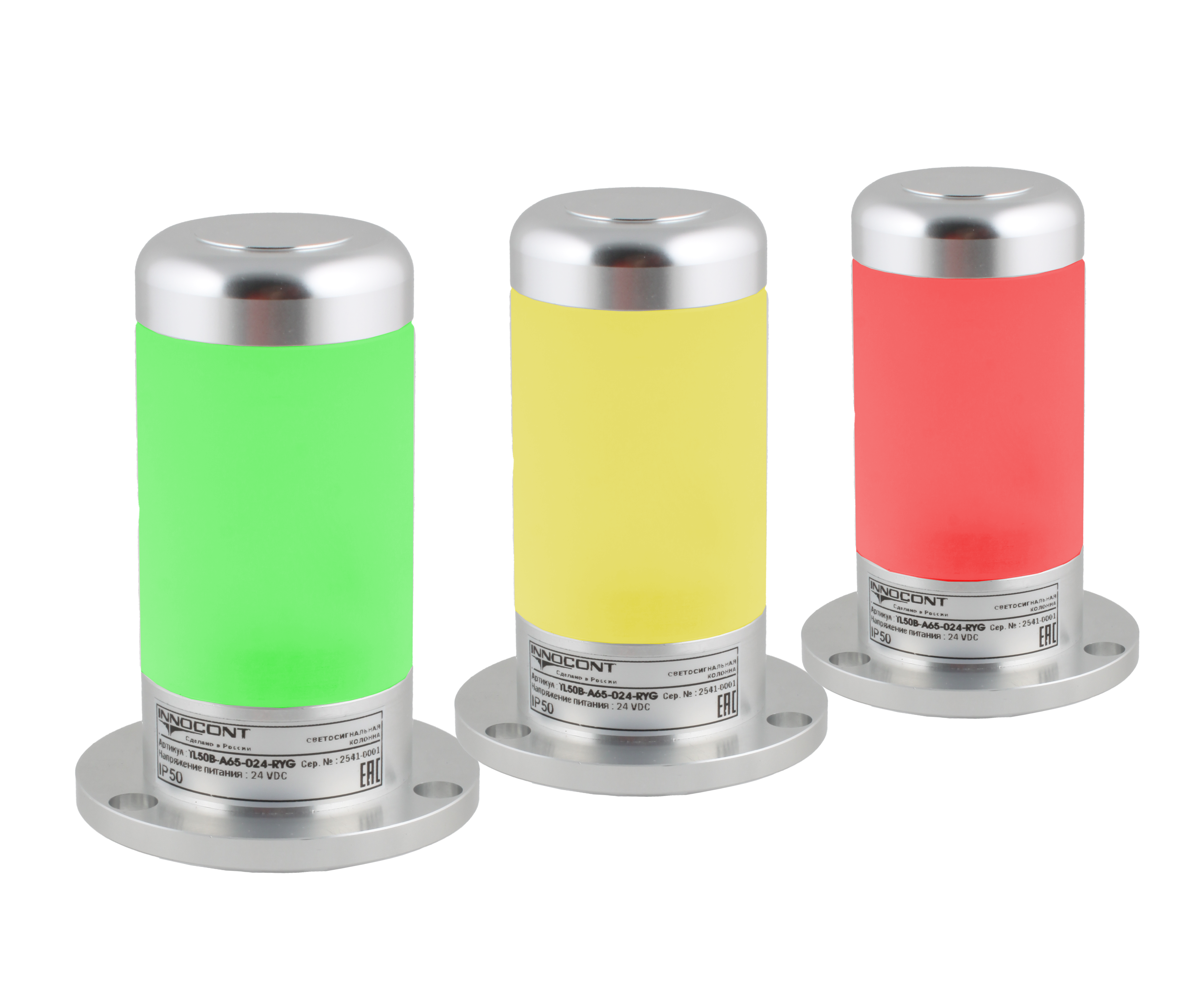 TL50B-A65-024-RYG Светосигнальная колонна INNOCONT, алюминиевый корпус, d=50, L=65, светодиод, постоянное свечение, трехцветный: красный, желтый, зеленый, с зуммером, 24VDC, IP50
