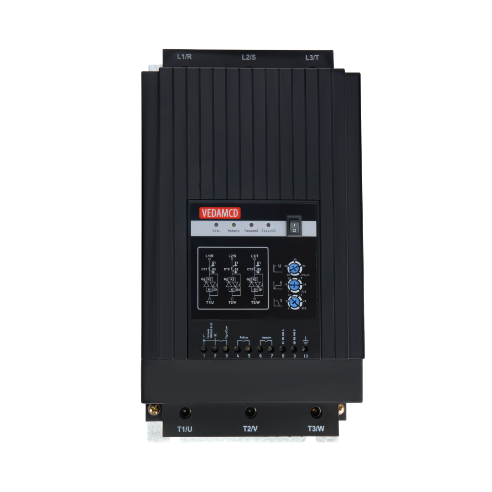 Устройства плавного пуска MCD1 для ТРЁХФАЗНЫХ двигателей 3*380В. Напряжение управления питания 24В, без кнопки "Пуск". УПП VEDA MCD1 предназначено для приводов на базе однофазных или трехфазных асинхронных электродвигателей 0,37-75 кВт. Оборудование оснащено байпасом для шунтирования устройства после разгона вала до номинальной скорости.Оборудование:Может оснащаться интерфейсом RS-485 с поддержкой Modbus RTU для связи с автоматизированной системой, кнопкой «Пуск» на панели для местного управления.Обеспечивает старт на заданном токе или напряжении, разгон пропорциональным повышением напряжения, торможение выбегом или плавным снижением напряжения.Выполняет функции защиты от перегрузок, обрыва фазы, короткого замыкания и других ненормальный режимов.Питание управляющей цепи – 220 В переменного или 24 В постоянного тока. Область применения УПП – электроприводы насосов, компрессоров, вентиляторов и другого оборудования с нормальной, средней и тяжелой нагрузкой.
