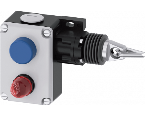 Выключатель оснащен функцией разрыва троса и тросового привода. Корпус металлический. Предусмотрена фиксация согласно EN ISO 13850 и кнопочный сброс. Оснащен светодиодной лампой 24 В DC. Цвет – красный. Предназначен для длины тросика до 50 метров.