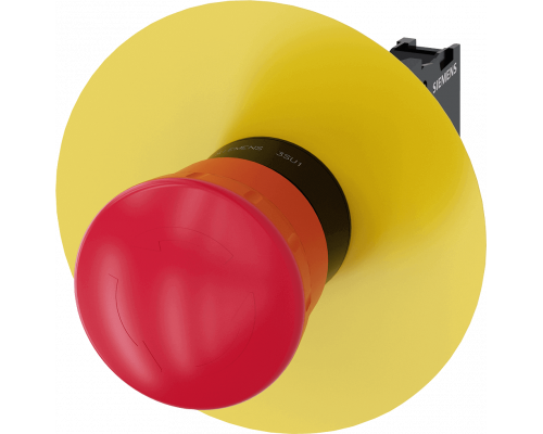 Кнопка имеет диаметр 22 мм и круглая форма. Изготовлена из красного пластика. Обеспечивается фиксация (positive latching) и деблокировка поворотом. Предусмотрена жёлтая подложка. Кнопка оснащена держателем и имеет один нормально замкнутый контакт (1nc). Подключение осуществляется через винтовые клеммы.