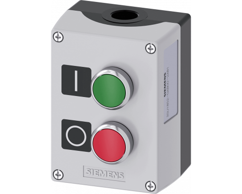 Пост управления выполнен с круглыми вырезами. Корпус изготовлен из металла, крышка корпуса – серая. Предусмотрено два командных элемента: зеленая кнопка 'i' (1но) и красная кнопка 'o' (1нз). Оба элемента оснащены винтовыми клеммами. Монтаж контактных модулей осуществляется на основании корпуса, предусмотрены отверстия M20 сверху и снизу (по одному каждому). Материал корпуса – металл.