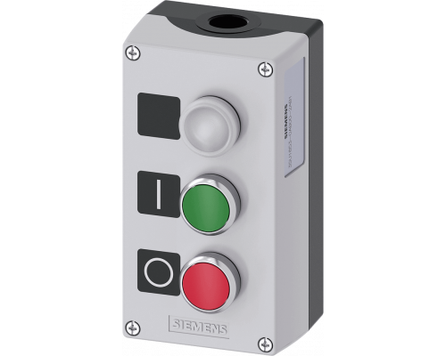 Пост управления выполнен с круглыми вырезами. Материал корпуса – металл, цвет крышки корпуса – серый. Имеются три командные точки: индикаторный свет (с=indicator light clear), зеленая кнопка (b=кнопка зелёная) с маркировкой "i" и красная кнопка (a=кнопка красная) с маркировкой "o". Все кнопки имеют винтовые клеммы. Доступен монтаж контактных модулей на основании корпуса, сверху и снизу – по одному разъему M20. Используется LED 24v.