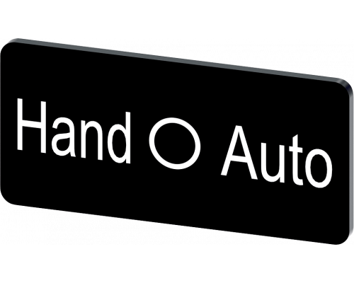 Табличка предназначена для наклеивания или защелкивания на держателе. Размер составляет 12.5 x 27 мм. Цвет таблички черный, надпись белая. Маркировка включает в себя надписи 'hand' и 'auto'.