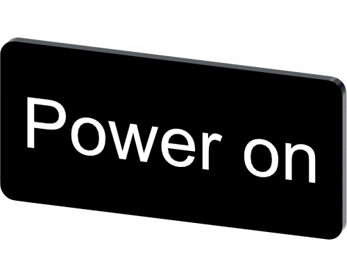 Табличка предназначена для наклеивания или защелкивания на держателе. Размеры составляют 12,5 x 27 мм. Цвет таблички черный, надпись белая. Маркировка включает надпись 'power on'.