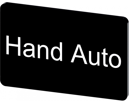 Табличка предназначена для наклеивания или защелкивания на держателе. Ее размеры составляют 17.5 x 27 мм. Цвет таблички черный, надпись белая. Маркировка включает слова "hand auto". Подходит для использования в различных промышленных условиях.