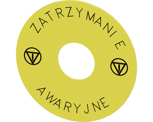 Подложка выполнена в желтом цвете и имеет маркировку (polish), zatrzymanie, symbol 5638, awaryjne, symbol 5638. Наружный диаметр подложки составляет 75 мм, диаметр отверстия – 22,5 мм, а толщина – 2 мм. Данное изделие предназначено для использования с кнопками аварийного останова.