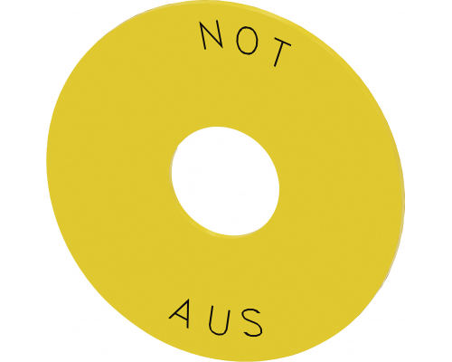 Подложка выполнена в желтом цвете и имеет маркировку 'not-aus'. Наружный диаметр подложки составляет 75 мм, диаметр отверстия – 22,5 мм, а толщина – 2 мм. Подложка предназначена для кнопок аварийного останова.